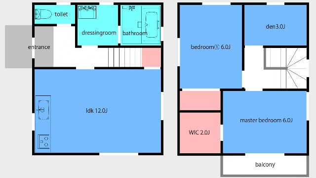 LDK 12.0 帖 | 主寝室 6.0帖 | 寝室(1) 6.0帖 | 小部屋 3.0帖 | WIC 2.0帖 | バルコニー