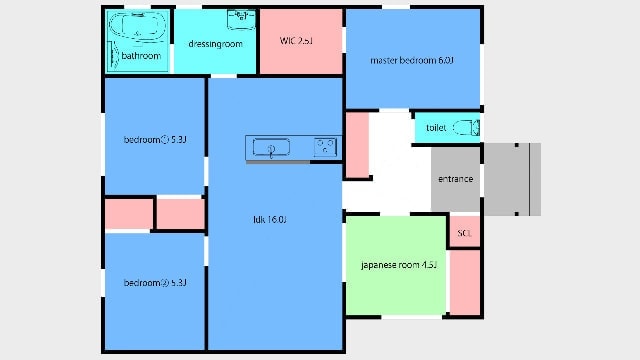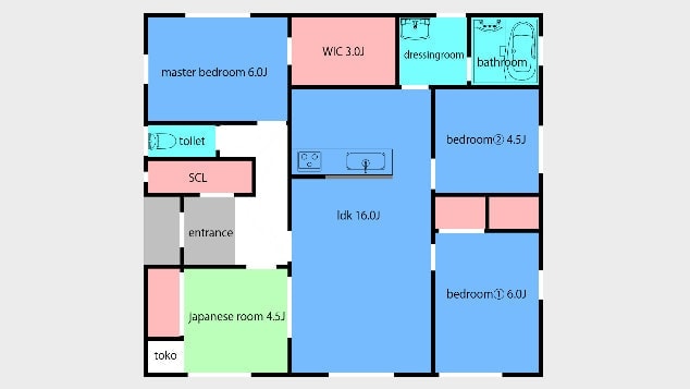 LDK 14.3 帖 | 主寝室 6.0帖 | 寝室(1) 6.0帖 | 寝室(2) 4.5帖 | 和室 4.5帖 | WIC 2.5帖 |