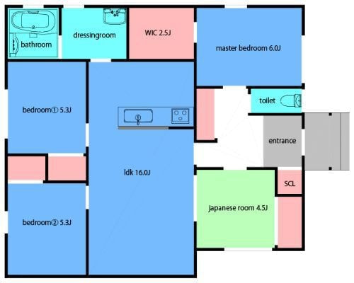 広々16帖のリビングダイニングを見れる対面キッチン、リビング続きの和室のある間取りです。ウォークインクローゼット、シューズクローゼットなどの収納も充分なプラン。