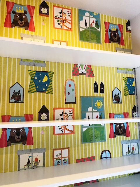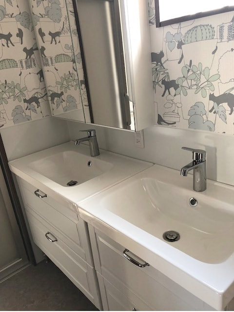 玄関を南側にしたところ。水回りをまとめたことによって、動線がすごくいい点がお気に入りです。猫好きなので、猫の絵柄が入った壁紙を使って、遊びました。